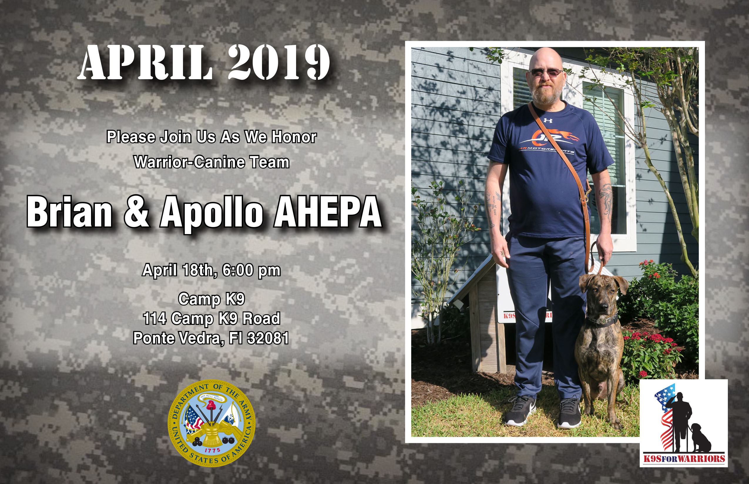 I just want to tell you and all the K-9 staff how much you all have changed my husband life and also mine. This program is such a life changing to veterans. We are planning things that I thought had gone out of our life's. Brian's attitude is so much better. Know one knows unless they live with a combat veteran what and how your life has changed since they returned home with the scares that will last a life time.