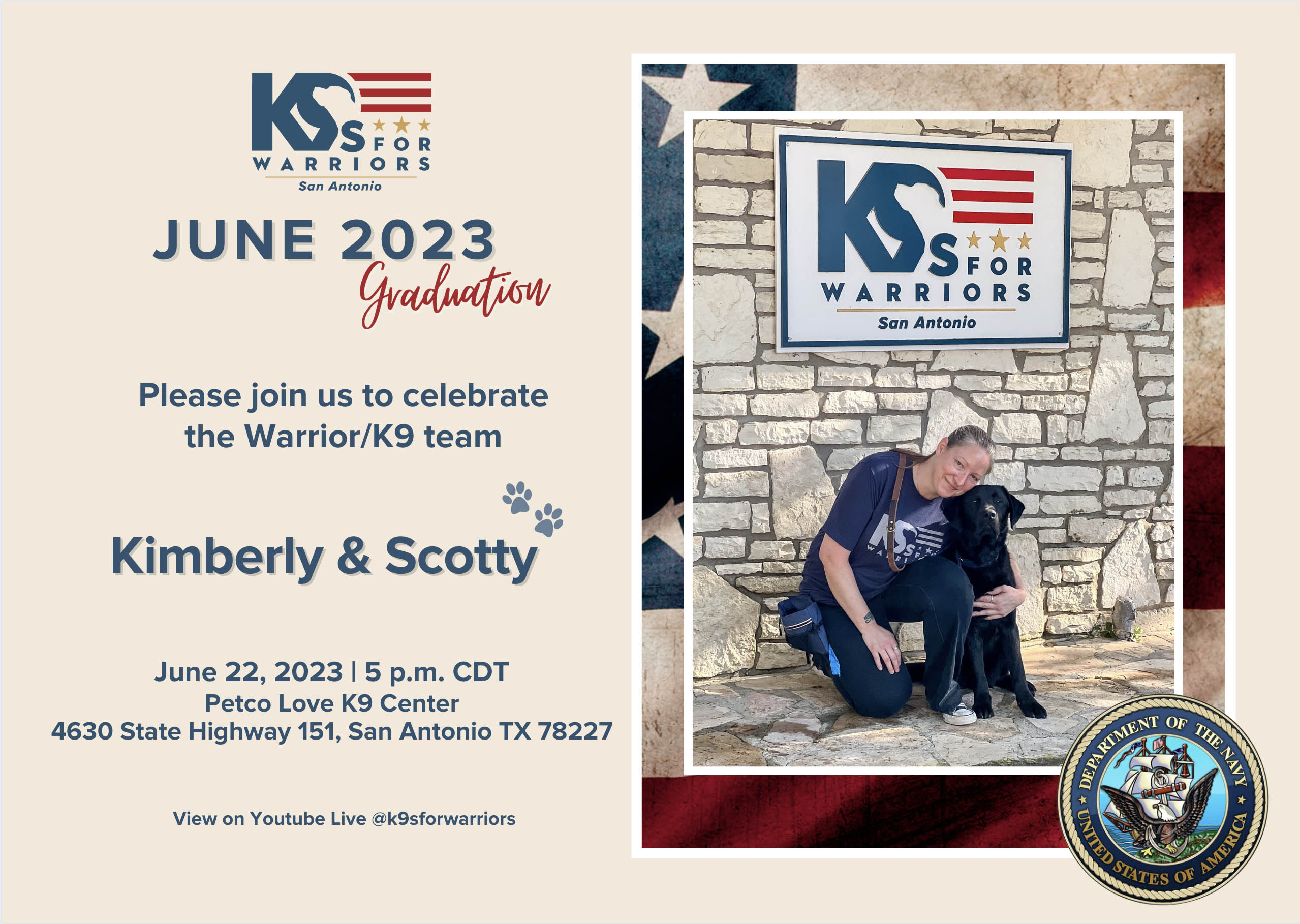 Hello everybody! Scotty here with an exciting update from Camp K9 in San Antonio. I’ve been working hard so I can learn all my commands and be the best boy I can be! Last week we went to the bookstore and lunch and I had a blast! This week I went to the River Walk and even got to ride in a boat tour, which was the coolest thing! Everybody complimented me on what a good boy I am (which like I KNOW, but it’s still nice to hearThere were lots of things on the ground that I wanted, but I was a good boy and didn’t pick them up. You can only imagine how hard that was for me! I’ve passed my Final Skills Test which means it’s only a matter of time before I meet my warrior. I’m so happy I will get to make such a difference in my future warrior’s life. ). I am learning my skills so quickly and my trainer is very proud of me! I better get back to work now, but I just wanted to thank you. Without your support, none of this would be possible! 06/09/2023