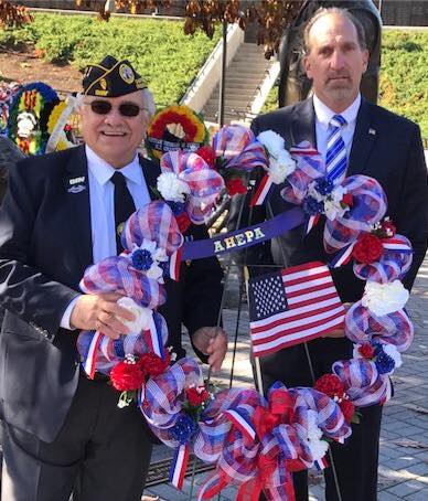 Laying a wreath at the Vietnam memorial with veteran George Karatzia (left).
